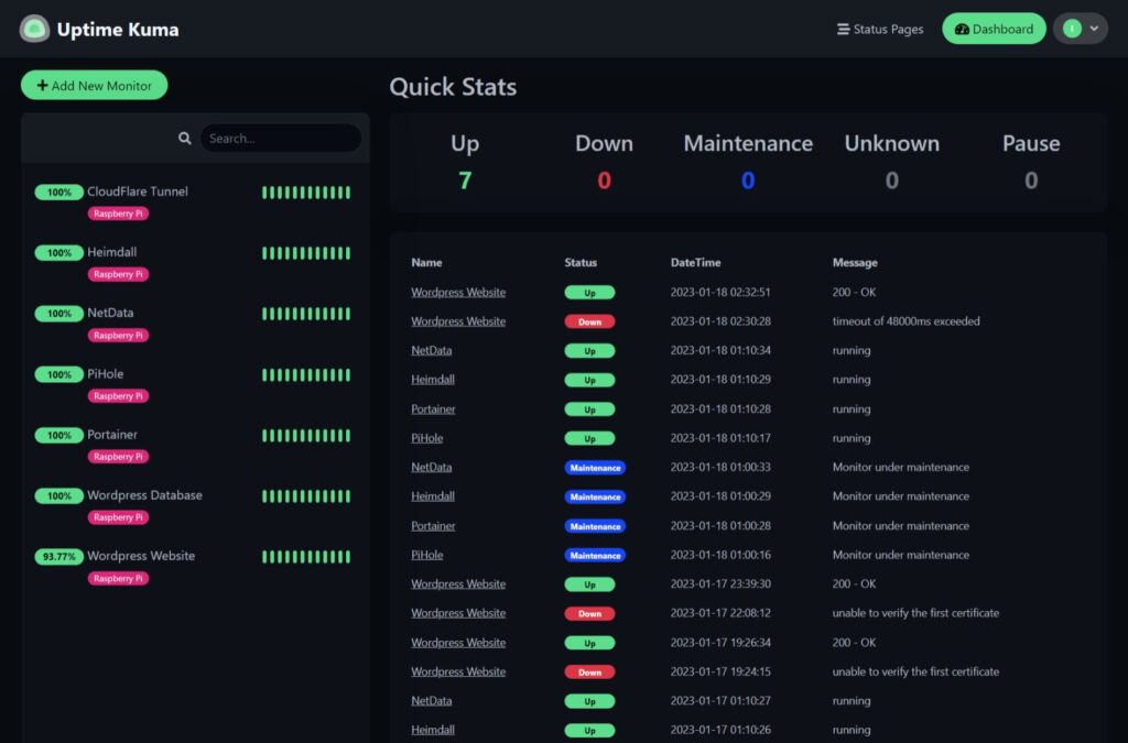 With Uptime Kuma, I can keep tabs on all my deployed services and applications like a boss, monitoring everything in real-time and getting instant notifications if something goes awry. I even set up custom checks and alerts to act as my personal “deployment squad” and keep me in the loop at all times.